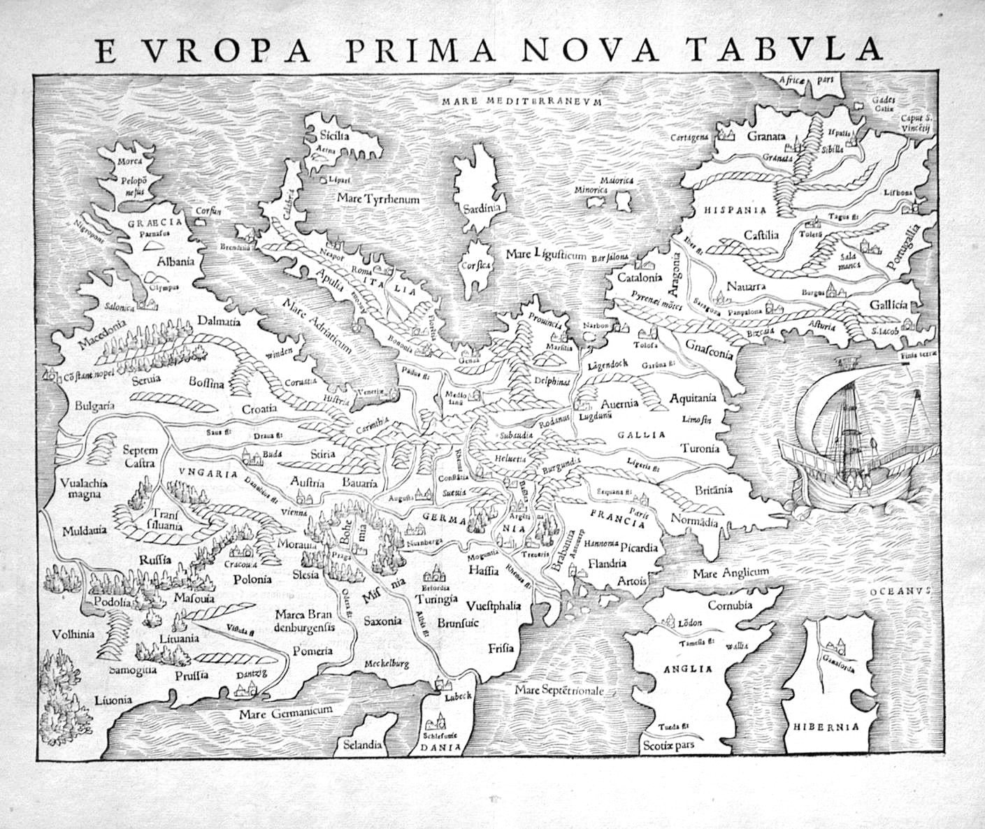 1540 карта Себастьяна Мюнстера "EVROPA PRIMA NOVA TABVLA" (Европа ...). Впервые эта карта была напечатана в "Geographia Universalis".